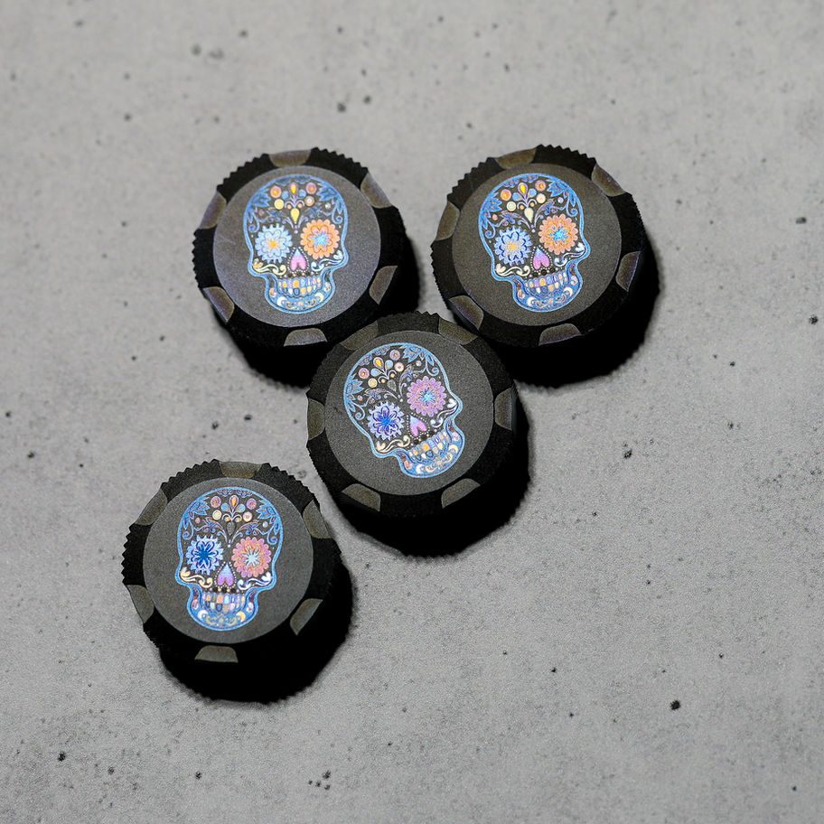 JULY 2025 CUSTOM CAP OF THE MONTH, SUGAR SKULL LIMITED TO 15 NUMBERED PIECES. AVAILABLE JULY 11, 2025 AT 9PM EST, LIMIT 2 PER HOUSEHOLD. EACH ONE HAS SLIGHT VARIATION IN COLORATION OF THE ENGRAVINGS MAKING THEM UNIQUE.